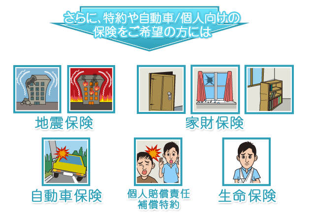 取扱商品、各保険の名称や補償内容等は、引受保険会社によって異なりますので、ご契約(団体契約の場合はご加入)にあたっては、必ず「重要事項説明書」をよくご確認ください。